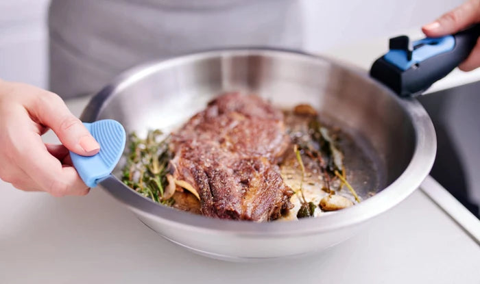 De hittebestendige siliconen handvatten worden eenvoudig op de schenkrand geschoven.